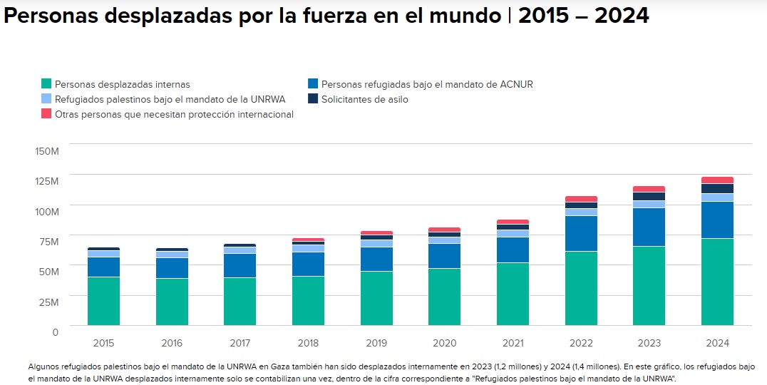 Según ACNUR, se estima que, a finales de 2024, en el mundo había 123,2 millones de personas desplazadas por la fuerza.