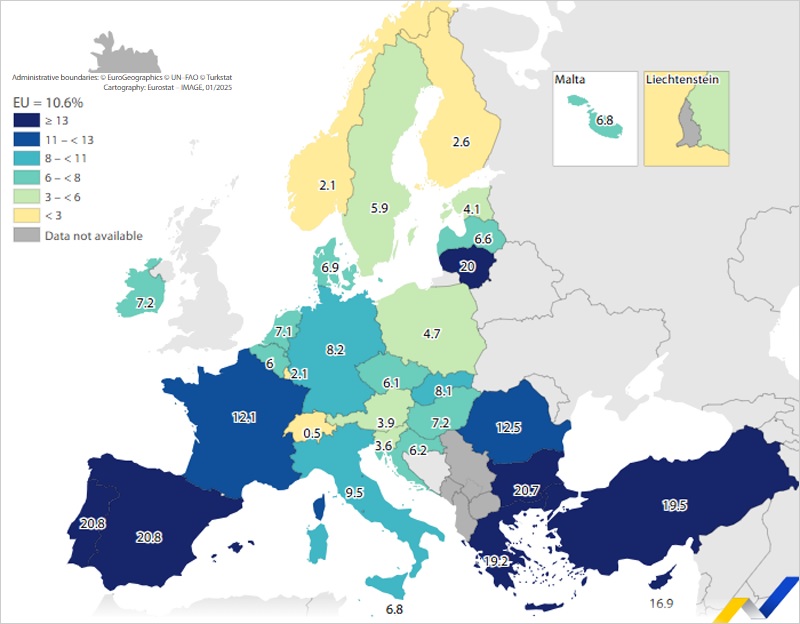 Como podemos comprobar, nuestro país parece empeorar sustancialmente sus datos en materia de pobreza energética, lo que se hace más evidente si ampliamos la observación al resto de la Unión Europea. Según datos publicados por Eurostat, España era en 2023 –junto con Portugal– el país europeo con más hogares con problemas para mantener su hogar caliente en términos relativos, prácticamente doblando la media europea del 10,6% de la población que no pudo mantener su hogar adecuadamente caliente.